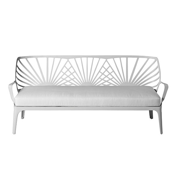 Il Divano Sunrise di in Driade è un mobilia esterna in alluminio laccato bianco. Questo divano basso parte della collezione Sunrise, disegnata da Ludovica e Robert Palomba. Questi ultra mobili di design e contemporaneità ci ricordano i vecchi mobili in ferro battuto. I disegni rappresentano un tramonto, da qui il nome "alba". Collezione Alba elegante e poetico, vi sorprenderà con il suo stile unico, questo incontro tra due epoche. Bene resistente agli agenti atmosferici, e ha una durata praticamente illimitata.