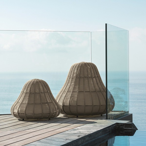 Lampada da tavolo a batteria progettata per uso esternoStruttura in acciaio inox e rivestimento in corda