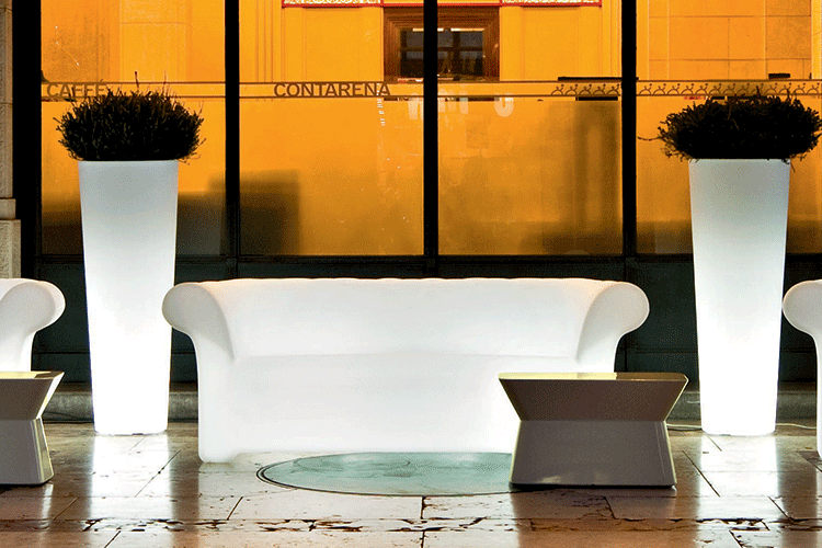 Divano Sirchester versione luce da Serralunga è parte dei sedili Sirchester destinati all'esterno famiglia composta da un divano e una poltrona che rivede la forma tipica e famoso divano Chesterfield con braccioli arrotondati e rivestimento imbottito.