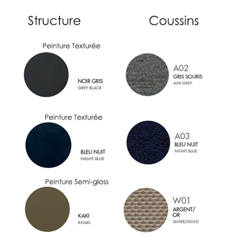 -Struttura con vernice strutturata colore grigio nero / schienale teak / cuscini in tessuto Perenni® colore mouse grigio-Struttura con vernice semilucida color kaki/schienale in teak/cuscini in tessuto impermeabile color argento-oro