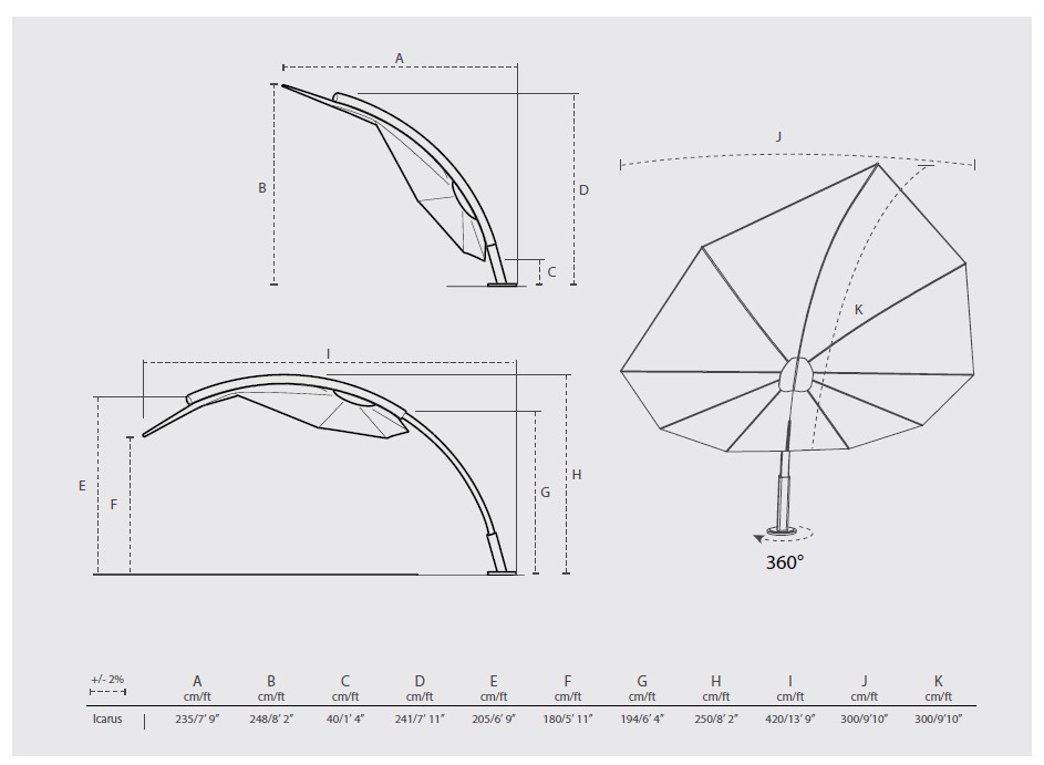 Molto elegante con la sua forma a foglia d'albero, il design di questo ombrellone offrirà un aspetto originale ed esclusivo a qualsiasi decorazione esterna. Icarus XL protegge sia dal vento che dal sole. Facile da installare e mantenere, questo ombrello ruota di 360° per adattarsi alla direzione del sole in base alle ore del giorno. La qualità di Icarus è stata studiata per resistere ai forti venti e offrire la migliore protezione possibile con il suo telaio in alluminio e fibra di vetro.
