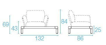 Poltrona dotata di 1 schienale, 2 braccioli, 1 cuscino schienale, 1 cuscino seduta e 2 cuscini braccioli (cuscini decorativi non inclusi, venduti su richiesta)Dimensioni: L132cm x prof 86cm x H84cm - Altezza della struttura senza cuscini 25cm - Altezza braccioli 69cm - Altezza seduta 43cm - Peso totale: 47,30KG
