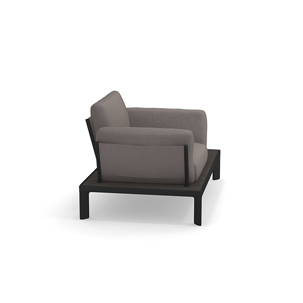 Poltroncina bassa progettata per uso esterno - Consegnata non assemblataStruttura in alluminio verniciato, dettagli in acciaio inox, doghe in WPC antracite (legno composito), tessuto sintetico su braccioli e schienale, cuscini seduta/schienale/braccioli in tessuto acrilico e schiuma