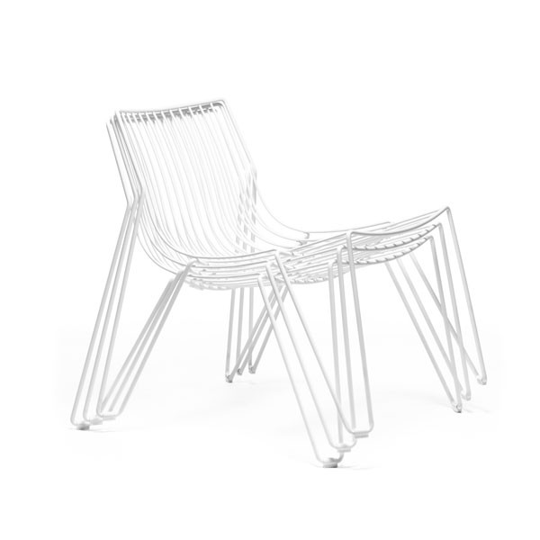 Questa poltrona bassa con struttura in filo d'acciaio si adatta a qualsiasi tipo di esterno.