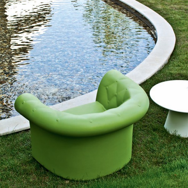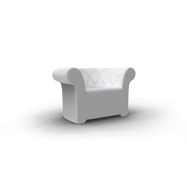La Poltrona Sirchester da Serralunga è parte dei sedili Sirchester destinati all'esterno famiglia composta da un divano e una poltrona che rivisita la forma tipica e famosa del divano Chesterfield con i suoi braccioli arrotondati e finitura imbottita.