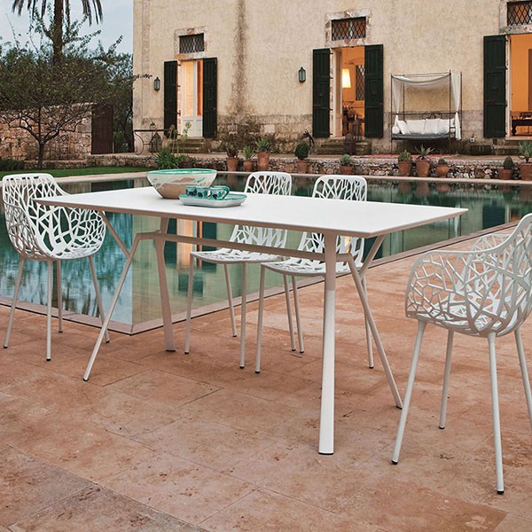 Il tavolo rettangolare L150cm Radice Quadra di Fast con il suo design moderno assicura una decorazione elegante. Questo tavolo da pranzo , che combina un design innovativo e una qualità unica, si adatterà perfettamente a tutti gli stili di decorazione. La base ricorda il segno matematico della radice quadrata, da cui il nome della collezione Radice Quadra. La sua struttura e il piano in alluminio verniciato gli conferiscono un'elevata resistenza agli agenti atmosferici, ai raggi UV e alle temperature estreme. Disponibile in diversi colori, potrai scegliere l'arredamento più adatto ai tuoi desideri. Il piano del tavolo può essere inclinato, il che consente di risparmiare spazio. Radice Quadra darà un tocco di modernità ai tuoi spazi interni ed esterni, portando comfort e design. Su una terrazza, in un giardino o in un soggiorno, vi permetterà di condividere momenti conviviali in qualsiasi momento.