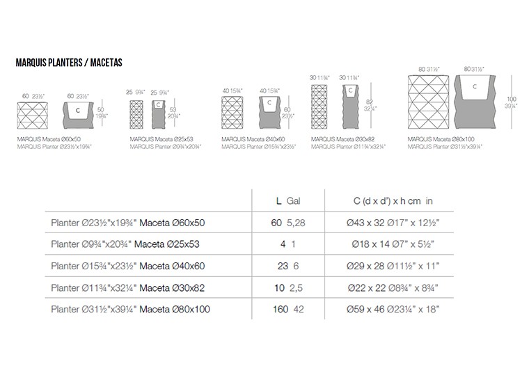 - Ø60cm x H50cm (interno: Ø43cm x H32cm)- Ø80cm x H100cm (interno: Ø59cm x H46cm )